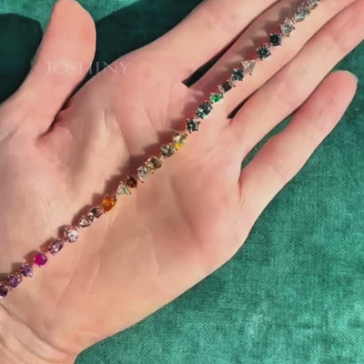 This exquisite and unique gemstone bracelet brings together a variety of fancy-cut gemstones, creating a vibrant and dazzling display that shimmers in the light. The gold chain is paired with refreshing blue, green, pink, yellow, and white gemstones, exuding elegance and unique taste. Whether worn casually or for important occasions, it will make you the center of attention, effortlessly complementing various styles and adding a touch of brilliance to your wrist.