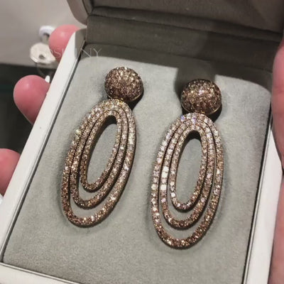These exquisite rose gold gemstone earrings feature a multi-layered oval design, adorned with dazzling gemstones, exuding luxury and elegance. They are the perfect finishing touch for a dinner party or special occasion.