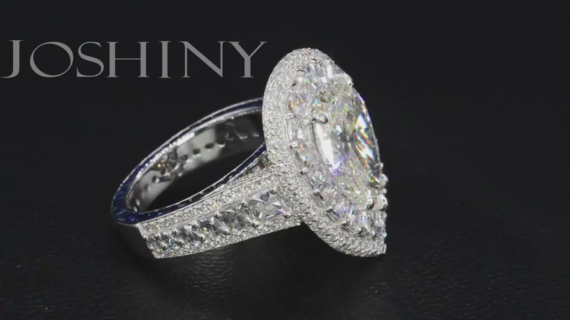 The dazzling pear-shaped gemstone ring, with its teardrop shape capturing countless rays of light, features a double-layered cluster of gemstones surrounding the main gemstone and a staggered trapezoidal gemstone arrangement on the band. It is a luxurious badge of honor in the vow of love, giving her a lifetime of brilliance.