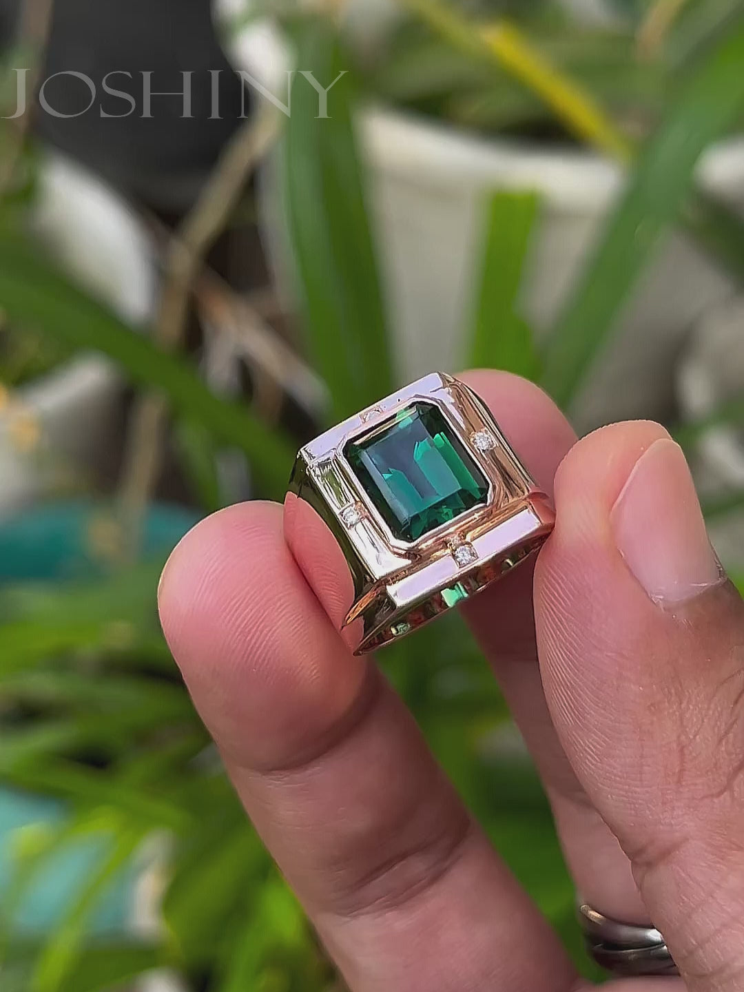 This is a ring with a simple design that has a sense of power. The center features a emerald cut emerald stone. It is surrounded by 4 round cut white side stones. The gold band is unique and elegant. The ring is made of 925 silver throughout, with thick gold plating, which makes the luster last longer compared to other single layer plating. The style is personalized and simple, bringing more possibilities for your fashion collocation.