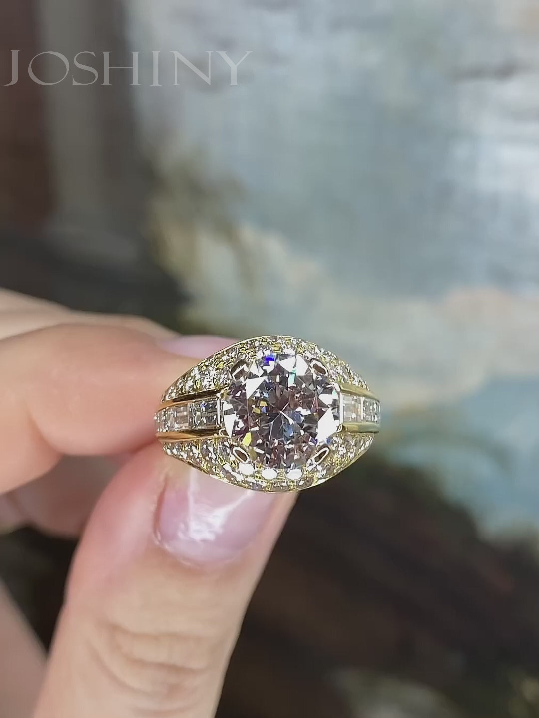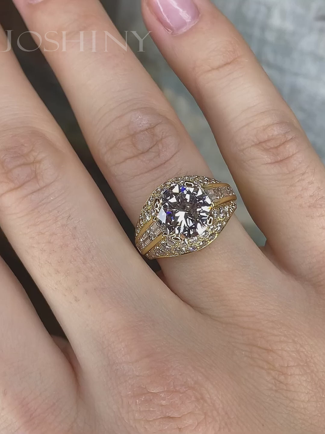 This is a gorgeous ring that can be worn by both men and women. The center features a 3 carat round cut brilliant white stone. It is surrounded by round and baguette cut stones set around it. Total weight is approximately 6 carats. The ring is made of 925 silver throughout, with thick gold plating, which makes the luster last longer compared to other single layer plating. The style is personalized, bringing more possibilities for your fashion collocation.