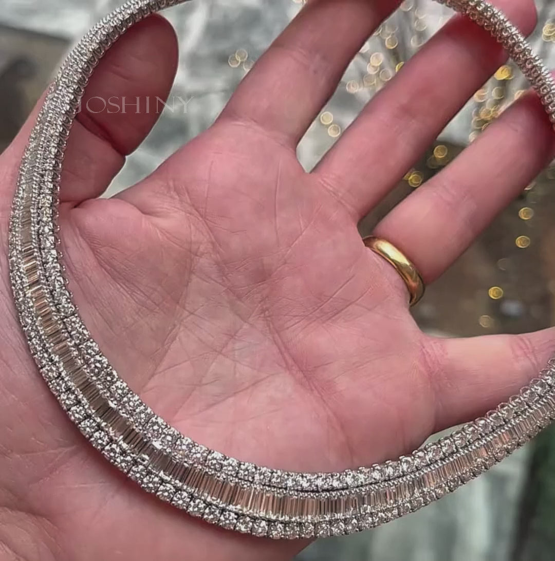 This platinum gemstone necklace, set with dazzling round and baguette-cut gemstones, radiates brilliance and exudes luxurious elegance. Versatile and stylish, it suits any occasion, allowing you to radiate captivating charm at all times.