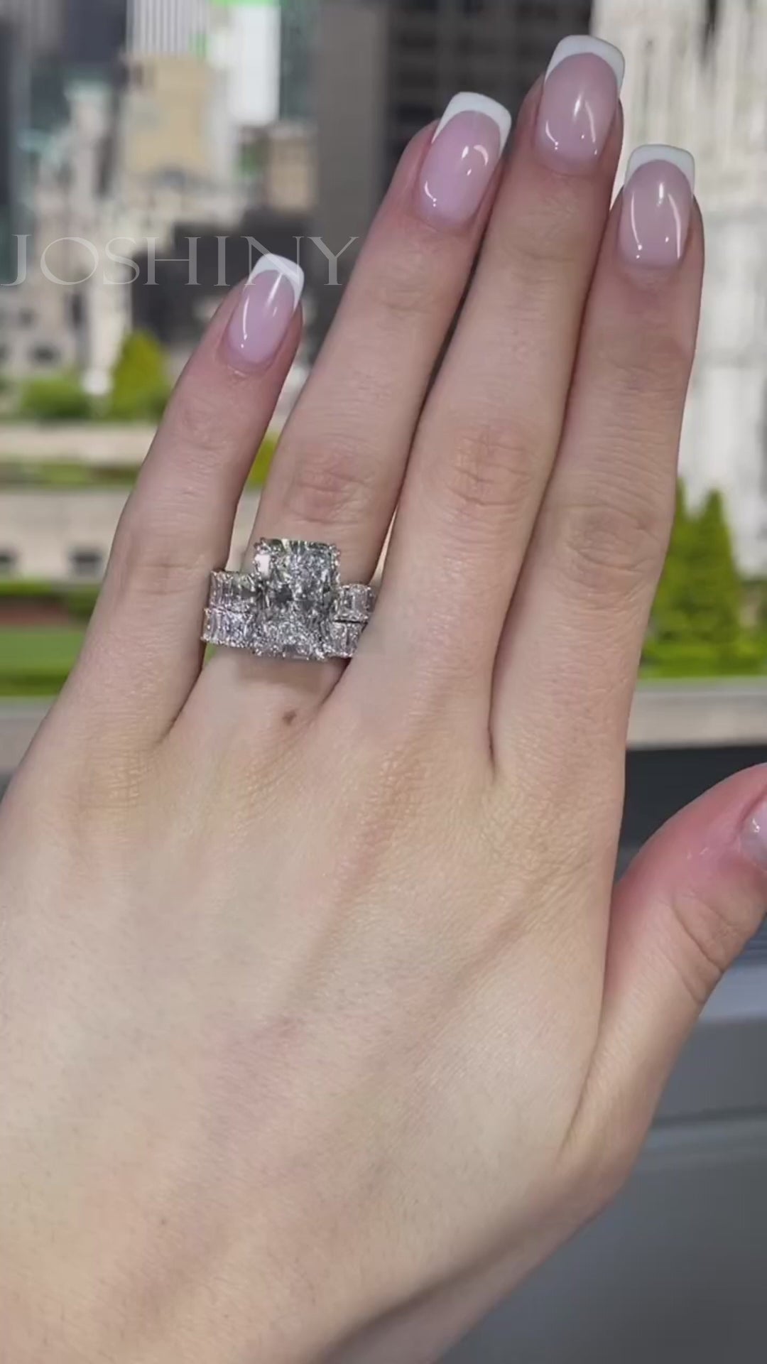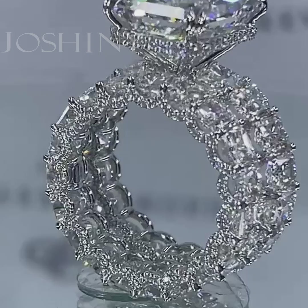 With a 360-degree design feel, the ring shows off well from any angle. This deluxe full-set two-piece engagement ring has 6ct, radiant cut main stone. The ring is made of 925 silver through and through, with thick gold plating, which makes the shine last longer compared to other single layer plating. The style is personalized and luxurious, bringing more possibilities for your fashion matching.
