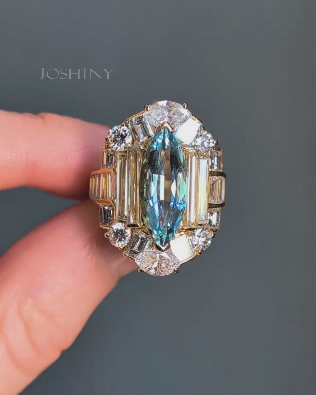 This vintage-inspired and glamorous ring features a marquise-cut aquamarine at its center, complemented by dazzling multi-cut gemstones and a gold band, exuding elegance and captivating charm at first sight.