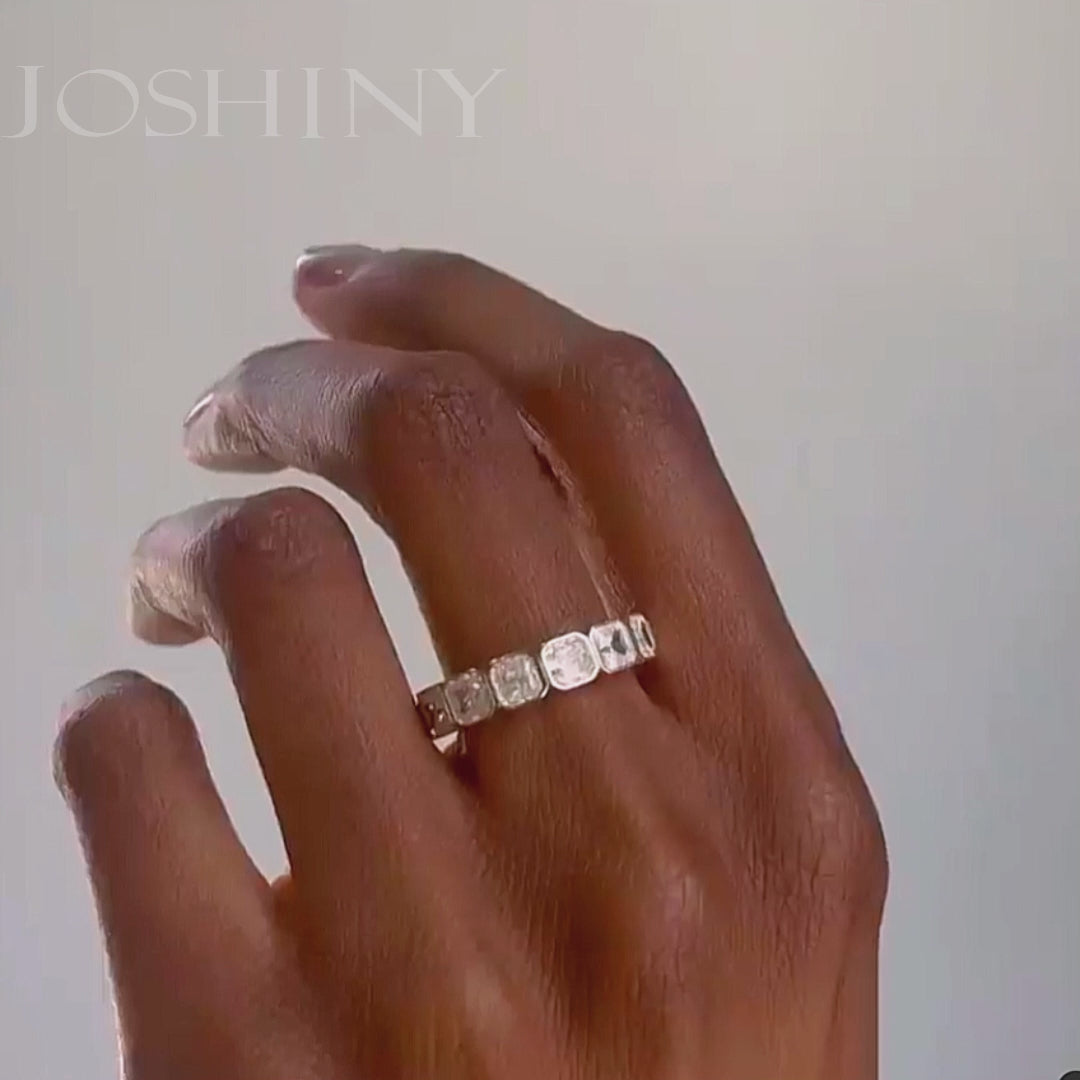 This is a minimalist design wedding ring for men and women. 6ctw halo assche cut white stones is 360° sparkle!The ring is made of 925 silver throughout, with thick gold plating, which makes the luster last longer compared to other single layer plating. The style is personalized and simple, bringing more possibilities for your fashion collocation.