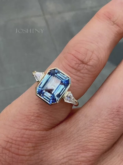 This exquisite blue sapphire ring features a striking center stone flanked by two sparkling clear white gemstones. The unique bezel setting highlights the gemstones' color and cut, while the overall design is elegant and modern, suitable for various occasions and showcasing unique taste.