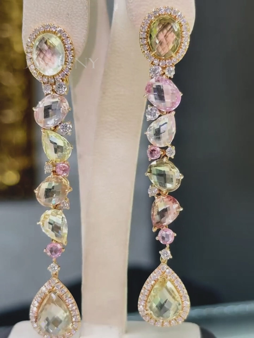 These dazzling earrings are set with a variety of colored gemstones, such as pink, yellow, and clear stones, featuring teardrop and oval cuts and exquisite gemstone borders. They dangle gracefully, catching the light and radiating a captivating glow, making them the perfect finishing touch for any occasion, showcasing the wearer's elegance and taste.