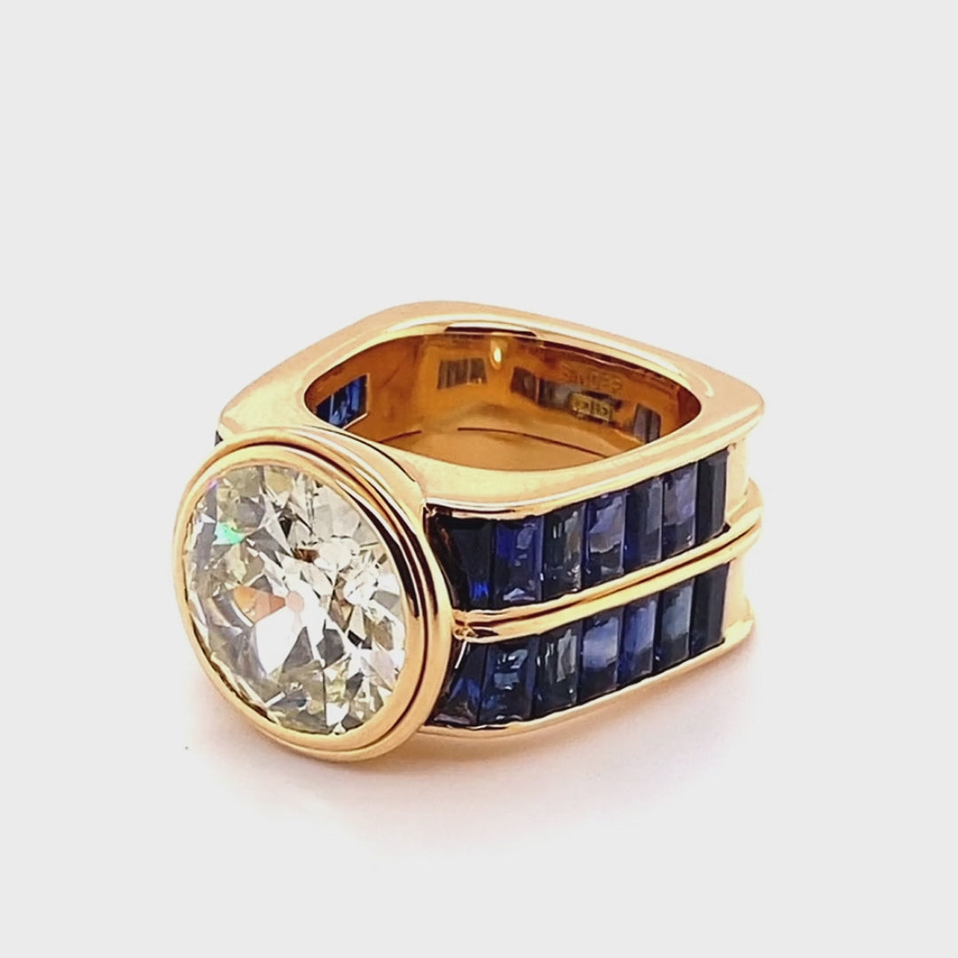 A perfect blend of antique gemstones and modern design. The 7.21 ct old European cut gemstone is set in a beautiful double border. The shoulders of the massive ring base are set with 28 carefully calibrated blue stones. A bold design. Total gemstone weight 9.33 ctw.