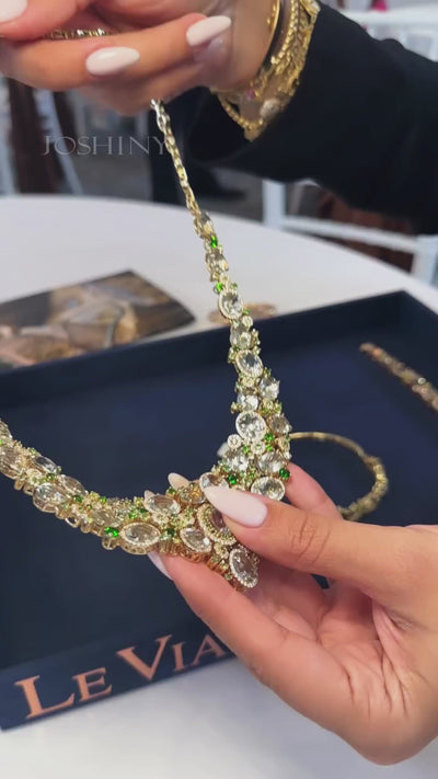 This exquisite necklace, set with dazzling gemstones and accented with touches of green, exudes elegance and luxury. Perfect for evening wear, it elevates your style and makes you the center of attention.