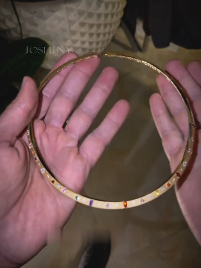 This dazzling gold choker, adorned with colorful gemstones, exudes elegance and sophistication. Its unique rigid design makes it the perfect finishing touch to any outfit, showcasing exceptional taste.