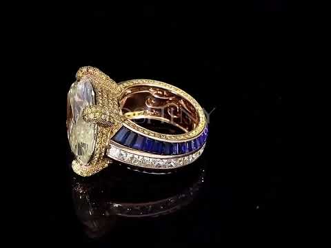 This stunning ring features an 8.0ct oval fancy yellow stone and 2.71 ctw of blue stones, all set in 18ct gold.