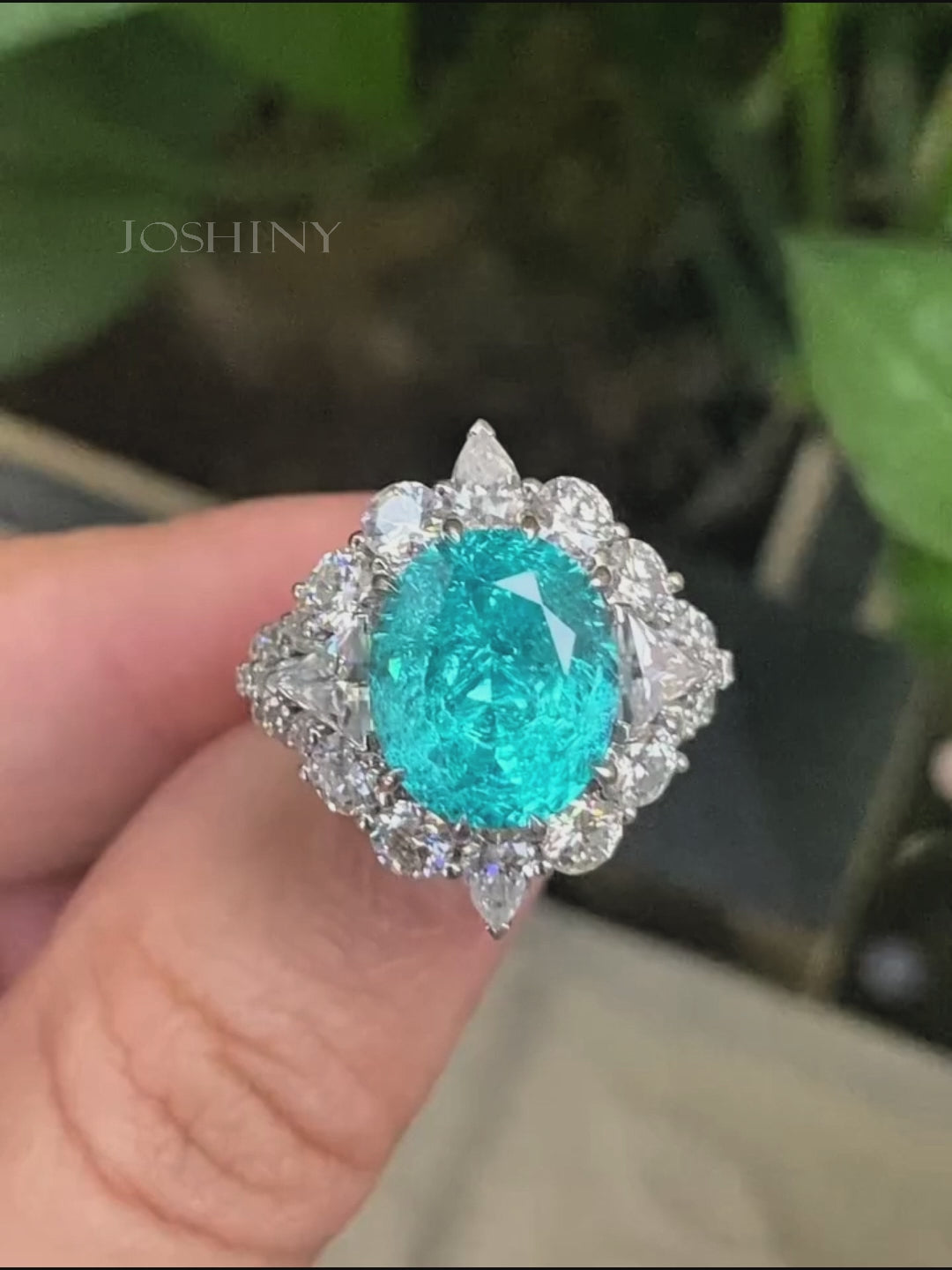 This Paraiba tourmaline ring is dazzling, with the center stone boasting a neon-like brilliance, seemingly capturing the purest blue of the ocean and sky. Surrounding it are brilliant gemstones, like stars around the moon, perfectly highlighting the rarity and radiance of the center stone. Wearing it exudes elegance and exceptional taste, making it a superb choice for collectors.