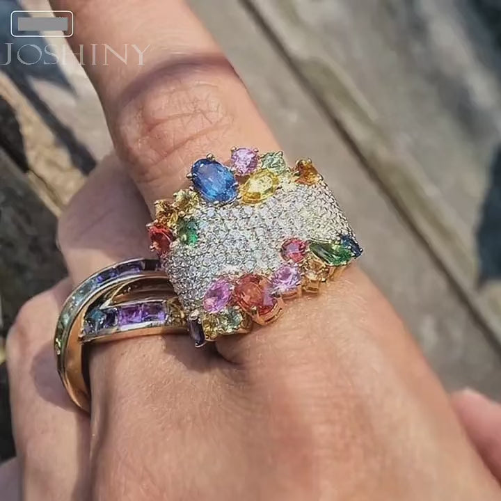 This stunning multi-gem cocktail ring is ideal for glamorous occasions. The design is opulent and the craftsmanship is intricate and dazzling. It is set with round-cut diamonds and various cuts of rainbow sapphires in colors like blue, pink, yellow, red, green, and orange. Â The ring is crafted with gold-plated metal, ensuring a luxurious and enduring shine. Its lavish and colorful style adds a touch of grandeur to your look, making it a perfect choice for parties, banquets, and other special events.