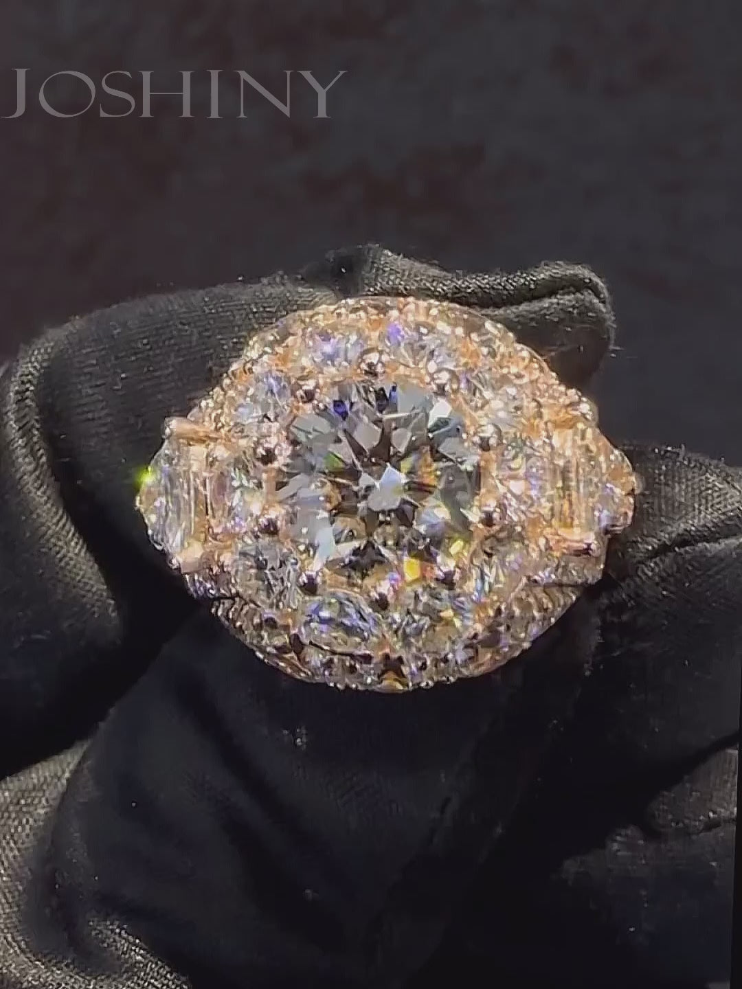 This is a luxurious men's ring full of power. The center features a brilliant round cut white main stone. It is surrounded by triangles and round cut white stones. Noble and sparkling. Total weight is approximately 9 carats. The ring is made of 925 silver throughout, with thick gold plating, which makes the luster last longer compared to other single layer plating. The style is personalized and luxury, bringing more possibilities for your fashion collocation.