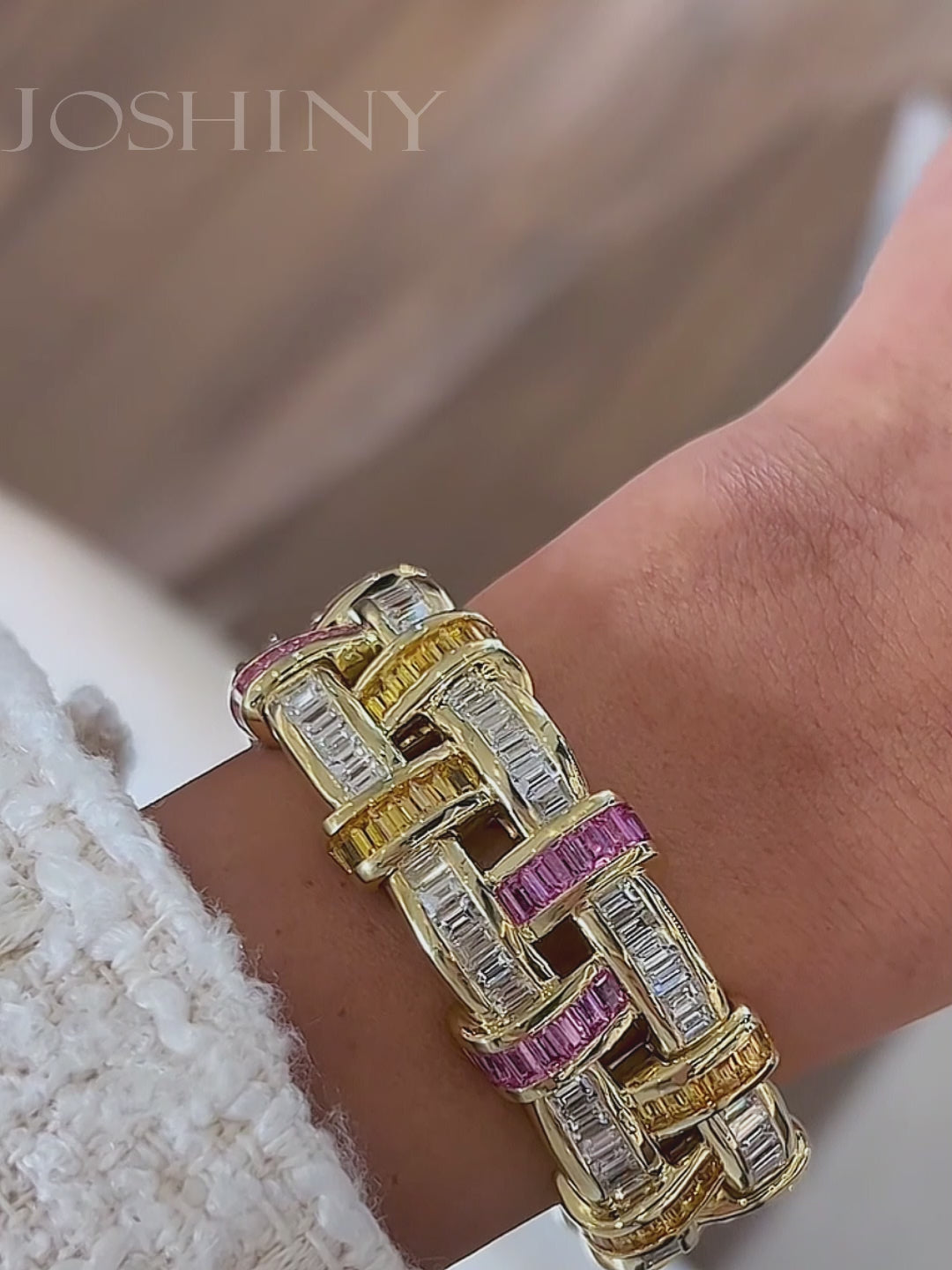 Art Deco multi-color bracelet. 10 ctw baguette cut multi-color gemstones in full settings. High quality touch!Two colorways for you to choose. The bracelet is made of 925 silver throughout, with thick gold plating, which makes the luster last longer compared to other single layer plating. The style is personalized and retro, bringing more possibilities for your fashion collocation.
