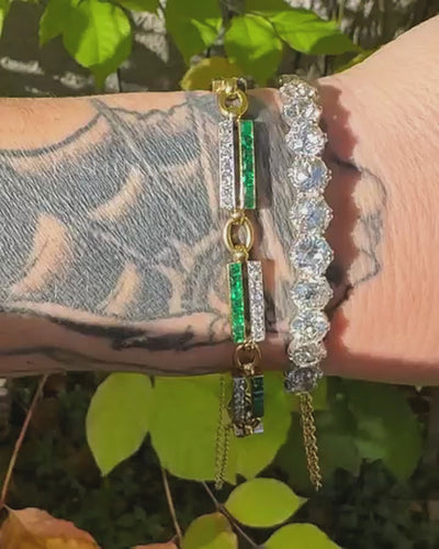💚 This French Art Deco emerald bracelet is one of the most unique bracelets we've ever seen. This bracelet is set with 56 exquisite square-cut emeralds, totaling approximately 3.91 carats; and another 56 old-mine cut gemstones, totaling approximately 1.75 carats. These beautiful gemstones are set in an 18K gold plated base, with platinum accents on top of the gemstone settings, perfectly complementing the gold base!