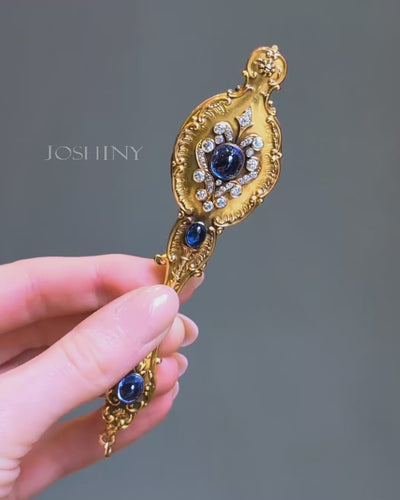 A long-handled brooch in the Belle Époque style, plated with gold, featuring a scroll-shaped engraved gold frame and decorated with cabochon blue gemstones and round-cut gemstone scroll motifs.