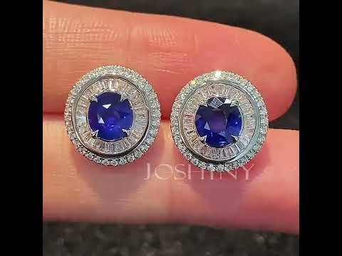 This is a classic and gorgeous earring design. The center features two deep, round cut sapphires surrounded by a brightly set trapezoidal, round cut white stone halo. The craftsmanship is exquisite and sparkling, making it suitable for many occasions. Total weight is approximately 3 carats.The earring is made of 925 silver throughout, with thick gold plating, which makes the luster last longer compared to other single layer plating. The style is classic and exquisite, bringing more possibilities for your fashion collocation.