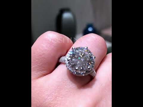 This is a classic engagement ring. The center features a brilliant round cut white main stone. The highlight is the separate round cut white stones pave set into an aperture. The ring arms are pave set with round cut white stones. The craftsmanship is exquisite and sparkling. Total weight is approximately 5 carats. The ring is made of 925 silver throughout, with thick gold plating, which makes the luster last longer compared to other single layer plating. The style is classic and gorgeous, bringing more possibilities for your fashion collocation.