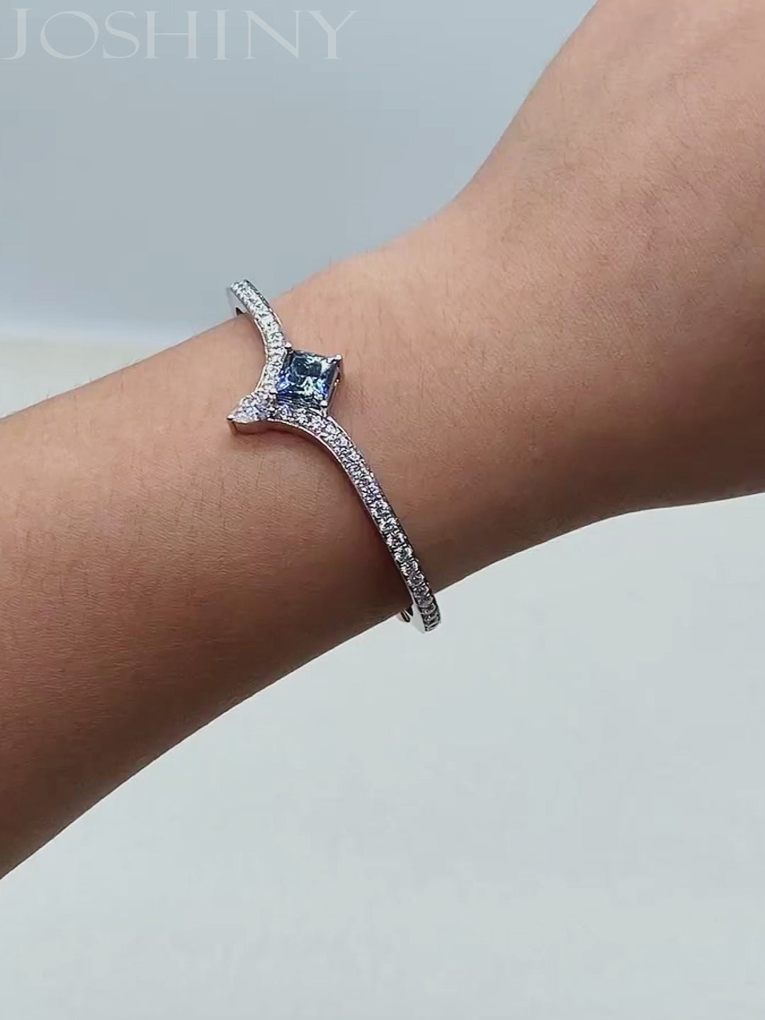 The delicate simplicity of this bracelet is suitable for many occasions. The center features a deep square-cut sapphire in a four-prong setting. The matching stones are set with a combination of pear and round cut white stones. Total weight is approximately 4 carats. The bracelet is made of 925 silver throughout, with thick gold plating, which makes the luster last longer compared to other single layer plating. The style is personalized and simple, bringing more possibilities for your fashion collocation.