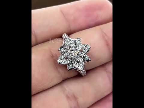 Make a statement with this elegant engagement ring! The unique floral shape is designed to stand out. The center features a brilliant round cut white main stone. The petals and ring arm are pave set with round cut white stones. The craftsmanship is exquisite and sparkling! Total weight is approximately 4 carats. The ring is made of 925 silver throughout, with thick gold plating, which makes the luster last longer compared to other single layer plating. The style is personalized and elegant, bringing more possibilities for your fashion collocation.