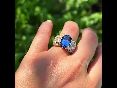 This is a vintage and elegant sapphire ring. The center is set with a deep and captivating cushion cut sapphire master stone. The ring arm is set with a combination of brilliant white stones in multiple cuts. Ideal for many occasions. Total weight is approximately 6 carats. The ring is made of 925 silver throughout, with thick gold plating, which makes the luster last longer compared to other single layer plating. The style is vintage and elegant, bringing more possibilities for your fashion collocation.