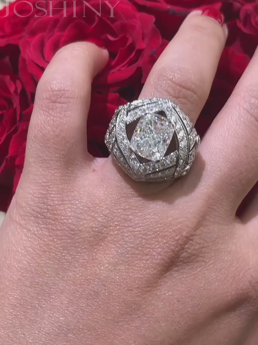 'Rose Love' ring - May you be as fresh and charming as a rose! The center features a sparkling cushion cut white main stone. It is surrounded by an Art Deco design pattern of pave-set round-cut white stones. Delicate and sparkling! Total weight is approximately 10 carats. The ring is made of 925 silver throughout, with thick gold plating, which makes the luster last longer compared to other single layer plating. The style is personalized and elegant, bringing more possibilities for your fashion collocation.
