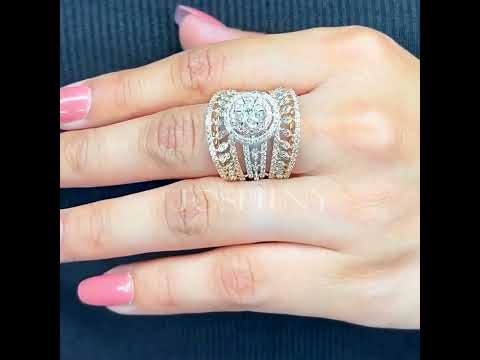 This is an engagement ring that makes a statement! Set with a combination of round and marquise white stones. The unique openwork pattern gives this ring a stylish and elegant look. Total weight is approximately 2 carats.The ring is made of 925 silver throughout, with thick gold plating, which makes the luster last longer compared to other single layer plating. The style is personalized and stylish, bringing more possibilities for your fashion collocation.