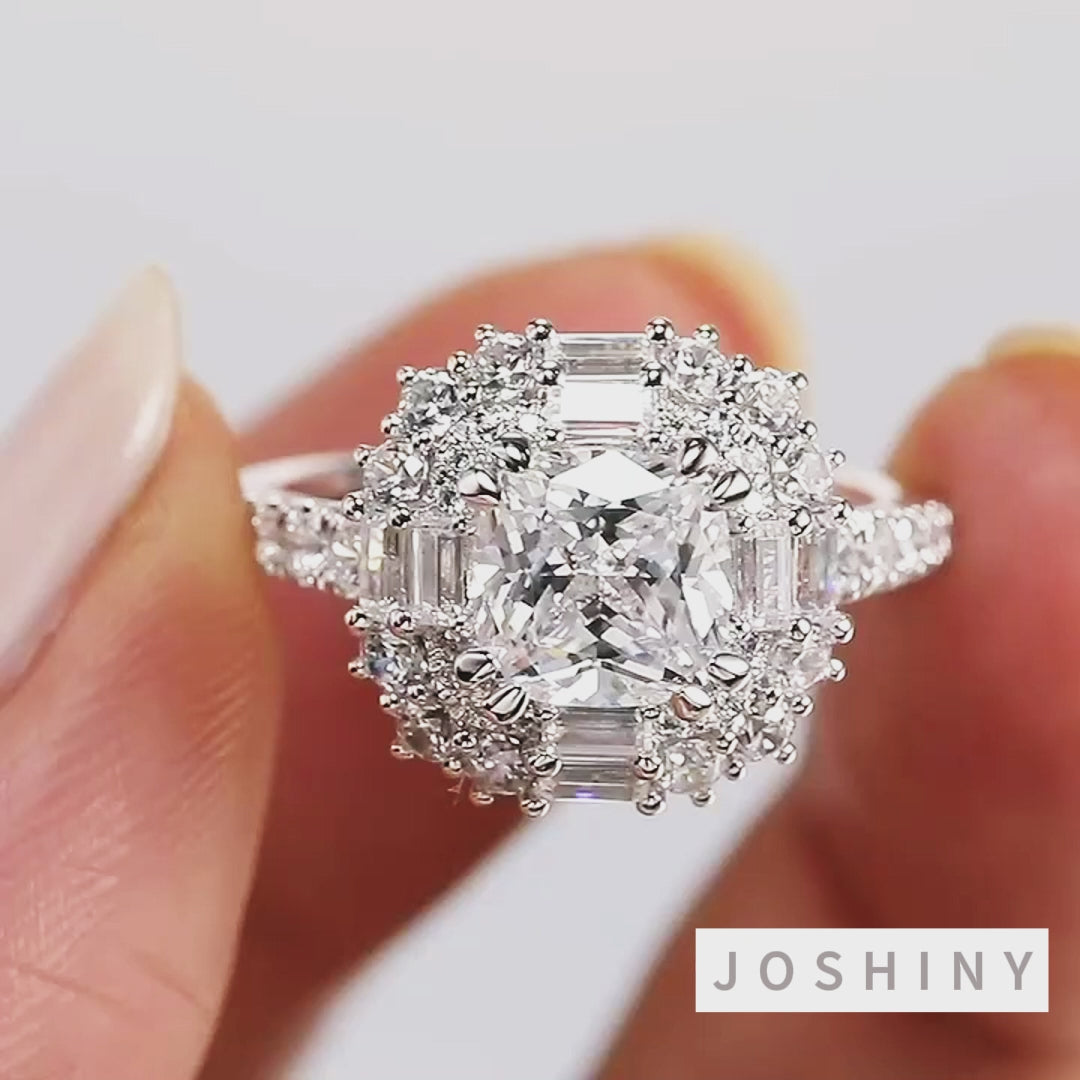This exquisite engagement ring is small and delicate. Perfect for everyday wear. The elegant design makes a statement. The center features a brilliant cushion cut white main stone. Surrounded by a halo of baguette and round cut white stones. Total weight is approximately 3 carats. The ring is made of 925 silver throughout, with thick gold plating, which makes the luster last longer compared to other single layer plating. The style is exquisite and elegant, bringing more possibilities for your fashion collocation.