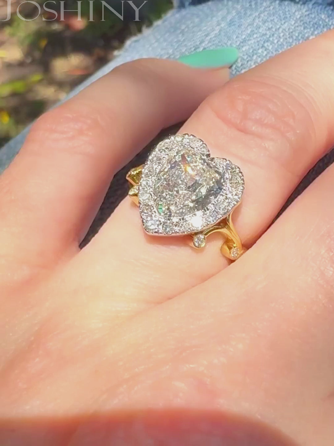 This delicate heart engagement ring is stunning! The design is elegant and stylish, the craftsmanship is exquisite and delicate, and it sparkles! The center features a sparkling heart cut white main stone surrounded by an aperture of round cut white gemstones. The unique vine design band arm is the highlight of this ring. Ideal to wear with many occasions. Total weight is approximately 4 carats.The ring is made of 925 silver throughout, with thick gold plating, which makes the luster last longer compared to other single layer plating. The style is personalized and exquisite, bringing more possibilities for your fashion collocation.