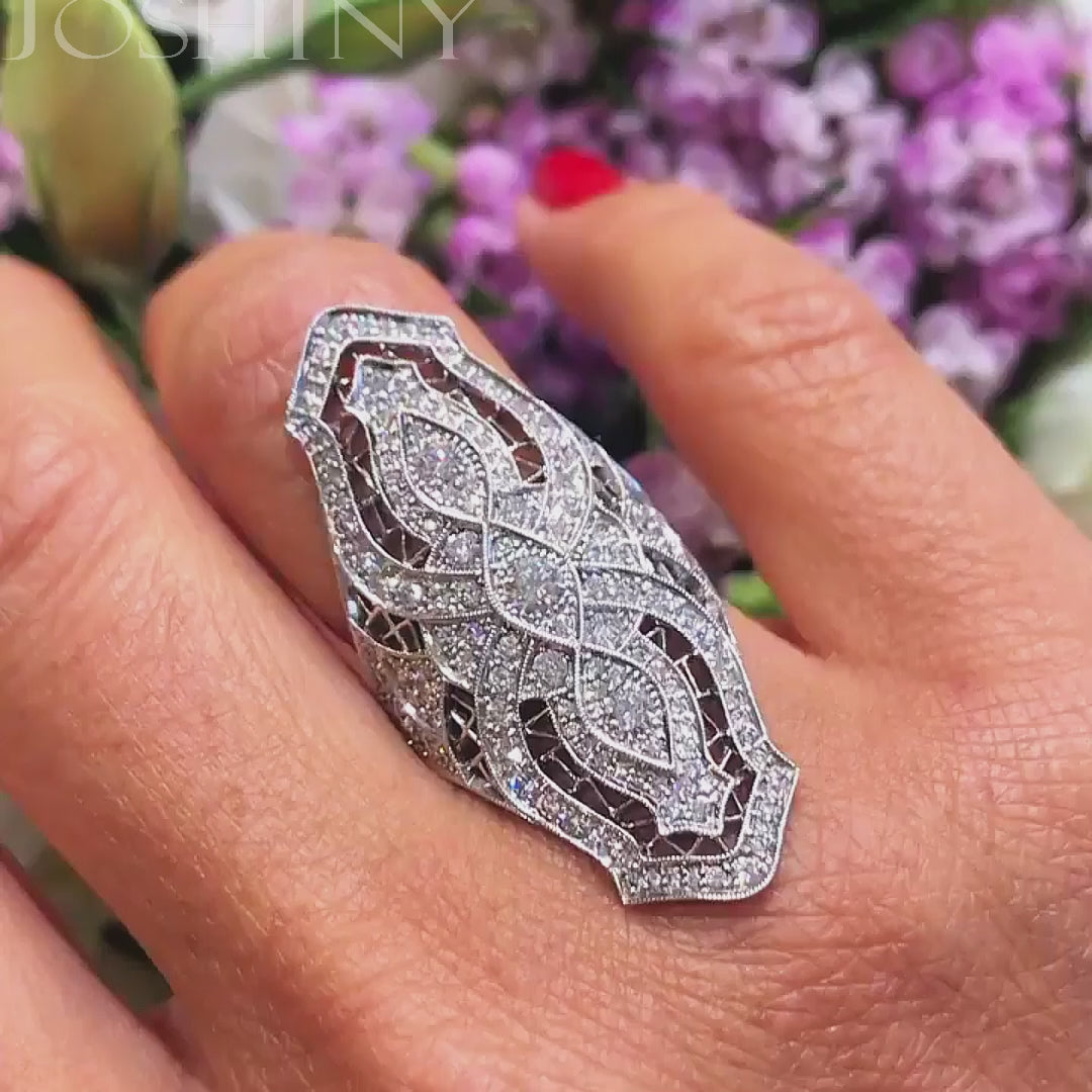 This is a stunning ring! The design is elegantly vintage and the craftsmanship is exquisite and delicate. It will make you the center of attention in any occasion! Features brilliant round cut white gemstone pave. Delicate lace pattern makes it a favorite! Total weight is approximately 4 carats.The ring is made of 925 silver throughout, with thick gold plating, which makes the luster last longer compared to other single layer plating. The style is personalized and exquisite, bringing more possibilities for your fashion collocation.