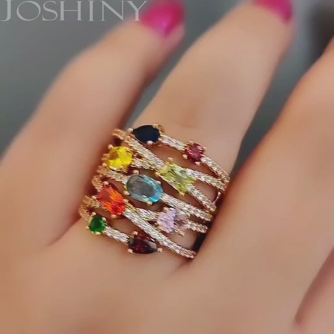 This is a ring with a stylish and colorful design that is unforgettable at first glance! Set with a combination of multi-cut colored gemstones. The craftsmanship is exquisite and delicate and sparkling! Comfortable to wear, perfect for everyday matching wear. Total weight is approximately 6 carats.The ring is made of 925 silver throughout, with thick gold plating, which makes the luster last longer compared to other single layer plating. The style is personalized and exquisite, bringing more possibilities for your fashion collocation.