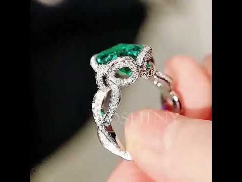 This beautiful ring will undoubtedly turn heads! Elegant and glamorous design with superb and sparkling craftsmanship. The center features a deep emerald cut emerald main stone. The elegant bow shaped band arm is fully set with round cut white stones. Total weight is approximately 7 carats. The earring is made of 925 silver throughout, with thick gold plating, which makes the luster last longer compared to other single layer plating. The style is personalized and elegant, bringing more possibilities for your fashion collocation.