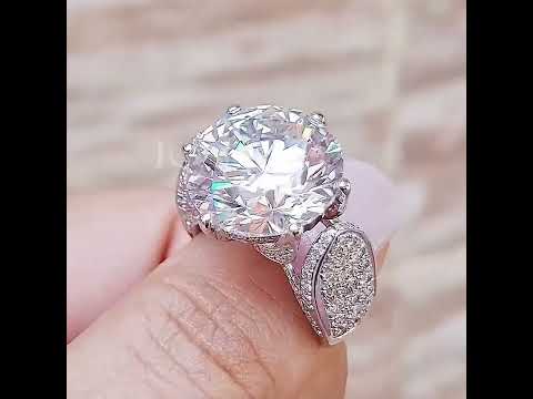 This is a gorgeous and elegant engagement ring. Classic design. The center is set with a bright round cut white stone. The sides are pave set with round cut white stones. Total weight is approximately 9 carats. The ring is made of 925 silver throughout, with thick gold plating, which makes the luster last longer compared to other single layer plating. The style is personalized and elegant, bringing more possibilities for your fashion collocation.