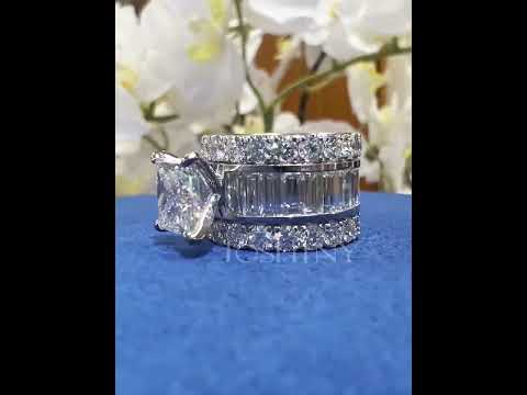 This is a stunning engagement ring! Features a brilliant square cut white main stone. The ring arm is fully set with baguette and round cut white stones. Extraordinary sparkle at every angle! Total weight is approximately 18 carats. The ring is made of 925 silver throughout, with thick gold plating, which makes the luster last longer compared to other single layer plating. The style is personalized and gorgeous, bringing more possibilities for your fashion collocation.