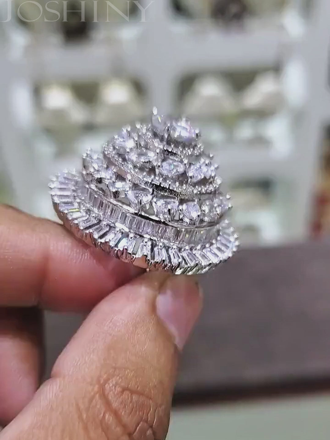 This is a stunning ring! The dreamy carousel shape is gorgeous and delicate. The center features a brilliant round cut white main stone. It is surrounded by a cluster of multi-cut white stones. It will make you the center of attention in a crowd! Total weight is approximately 6 carats. The ring is made of 925 silver throughout, with thick gold plating, which makes the luster last longer compared to other single layer plating. The style is personalized and gorgeous, bringing more possibilities for your fashion collocation.