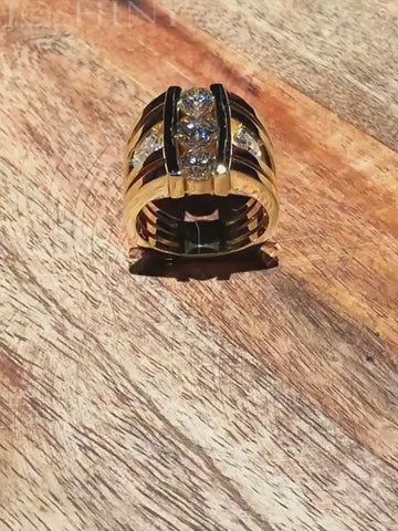 This stylish ring has a distinctive sense of power. The minimalist design is sophisticated and stylish. It can be worn by both men and women. Set with round cut white gemstones. Total weight is approximately 4.2 carats. The ring is made of 925 silver throughout, with thick gold plating, which makes the luster last longer compared to other single layer plating. The style is personalized and simple, bringing more possibilities for your fashion collocation.