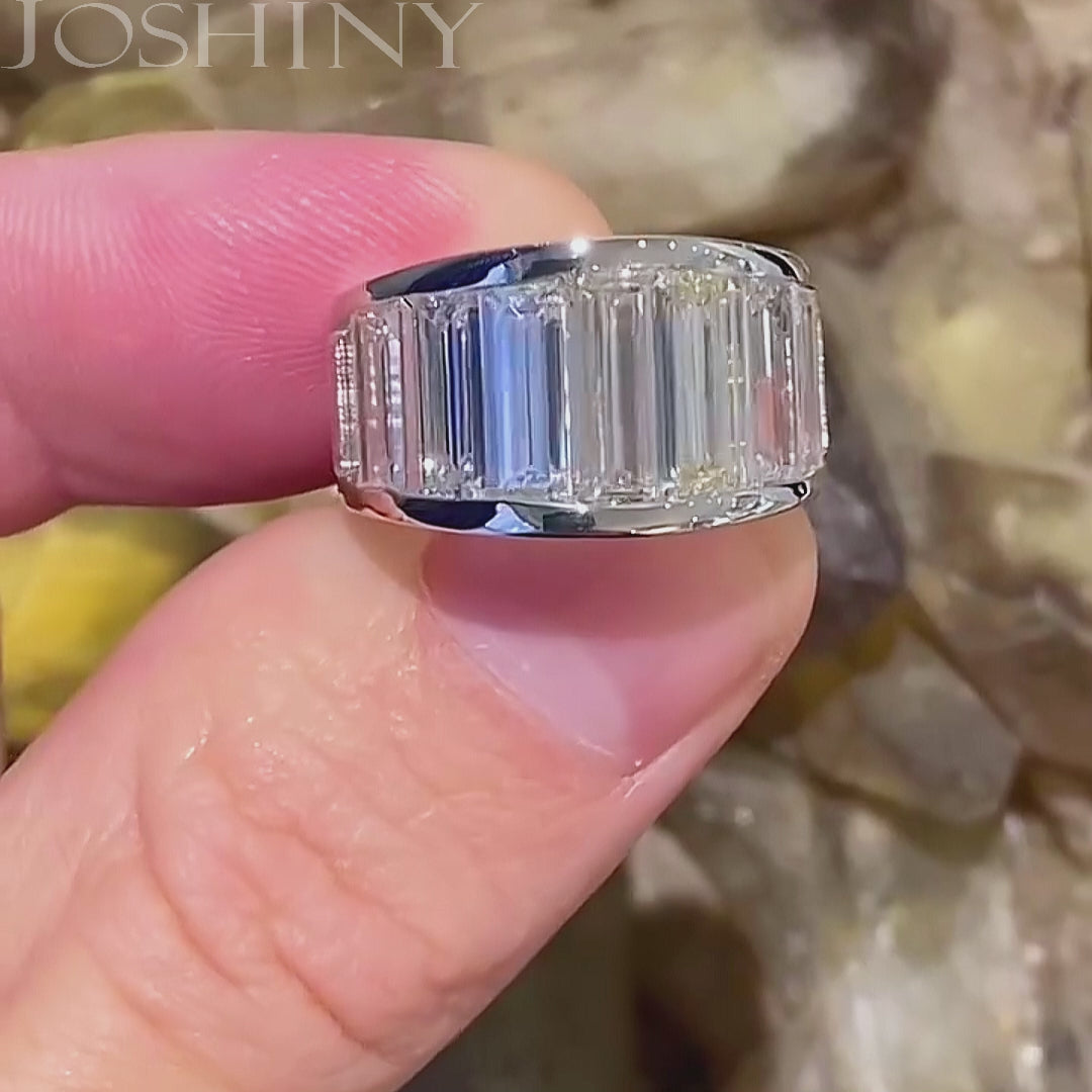 This is a simple and stylish ring that can be worn by both men and women. It is inlaid with a combination of bright trapezoidal cut white gemstones. The craftsmanship is exquisite and delicate, and it is comfortable to wear, very suitable for daily matching. The total weight is about 3 carats.The ring is made of 925 silver throughout, with thick gold plating, which makes the luster last longer compared to other single layer plating. The style is personalized and simple, bringing more possibilities for your fashion collocation.