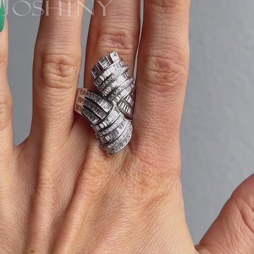 This is a ring with a stylish and unique design that is perfect for wearing with everyday wear. Set with a combination of brilliant baguette and round cut white stones. The craftsmanship is exquisitely detailed and sparkling! Comfortable to wear. Total weight is approximately 3 carats.The ring is made of 925 silver throughout, with thick gold plating, which makes the luster last longer compared to other single layer plating. The style is personalized and stylish, bringing more possibilities for your fashion collocation.