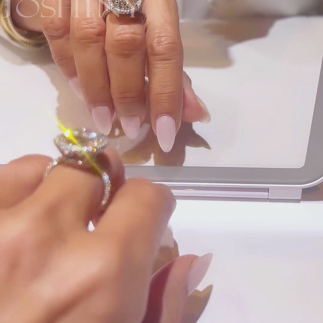 This is a classic and gorgeous engagement ring. Perfect to wear with many occasions. The center features a large bright round cut white main stone surrounded by a halo of round cut white gemstones. The craftsmanship is exquisitely detailed and sparkling. Total weight is approximately 10 carats.The ring is made of 925 silver throughout, with thick gold plating, which makes the luster last longer compared to other single layer plating. The style is classic and gorgeous, bringing more possibilities for your fashion collocation.