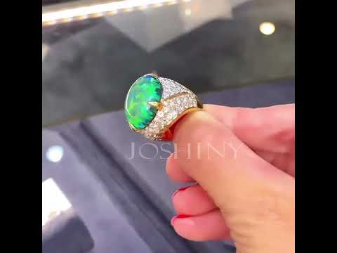 This gorgeous opal cocktail ring is very striking! The center features a gorgeous egg-faceted opal. The ring arms are pave-set with round-cut white stones in gold and silver color separation work. It looks exquisite and sparkling. Total weight is approximately 15 carats. The ring is made of 925 silver throughout, with thick gold plating, which makes the luster last longer compared to other single layer plating. The style is personalized and gorgeous, bringing more possibilities for your fashion collocation.