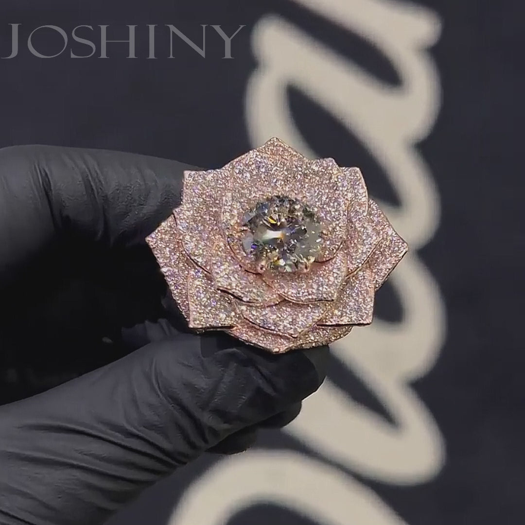 This rose made up of gemstones looks sparkling and eye-catching! It can accompany you to be the center of attention at any occasion. The center features a brilliant round cut white main stone of approximately 7 carats. The rose gold colored petal ring arm is fully encrusted. High quality craftsmanship looks exquisite. Total weight is approximately 16 carats. The ring is made of 925 silver throughout, with thick gold plating, which makes the luster last longer compared to other single layer plating. The style is elegant and gorgeous, bringing more possibilities for your fashion collocation.