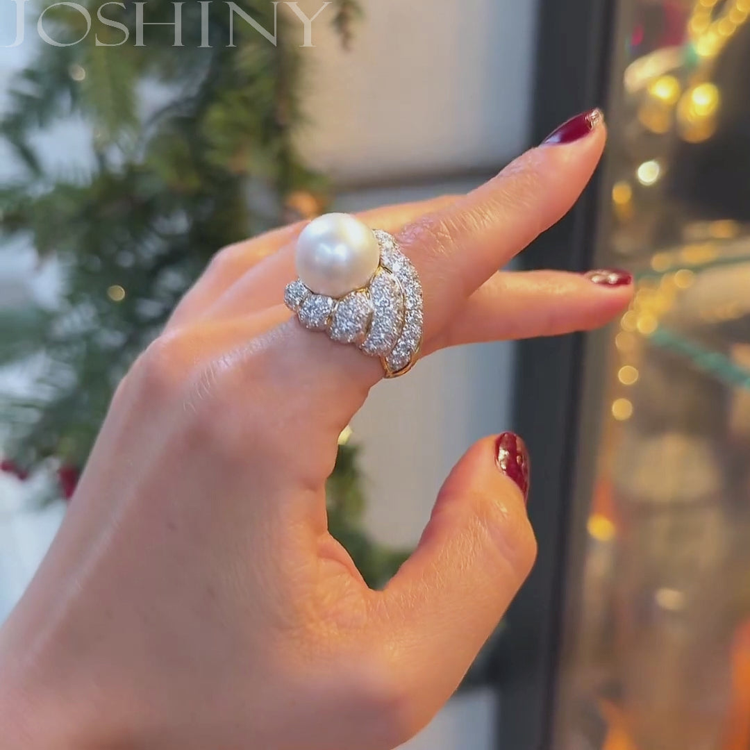 This is a ring with a gorgeous and elegant design that makes a statement! The center is set with a round, full white pearl. The surrounding arms are pave set with sparkling round cut white stones. The craftsmanship is exquisite and sparkling! Comfortable to wear and perfect for many occasions. Total weight is approximately 3 carats.The ring is made of 925 silver throughout, with thick gold plating, which makes the luster last longer compared to other single layer plating. The style is gorgeous and stylish, bringing more possibilities for your fashion collocation.
