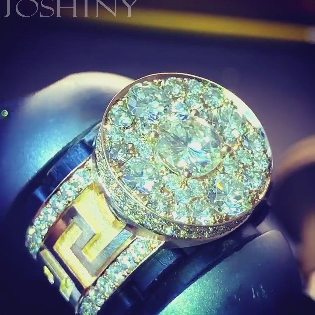 This is a unique and stylishly designed engagement ring that can be worn by both men and women. The center is set with a combination of brilliant round cut white stones. The ring arm has a golden refrain wrapped between a halo of pave set round cut white stones. The craftsmanship is exquisitely sparkling and comfortable to wear, making it suitable for many occasions. Total weight is approximately 4 carats.The ring is made of 925 silver throughout, with thick gold plating, which makes the luster last longer compared to other single layer plating. The style is personalized and gorgeous, bringing more possibilities for your fashion collocation.