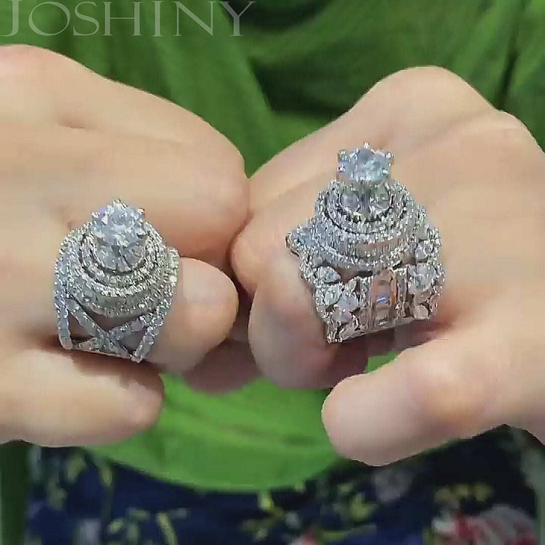 These two gorgeous engagement rings one large and one small are very unique and striking. The center of the little sister's ring features a brilliant round cut white main stone. The arms are set with a combination of trapezoidal and round cut white stones, and the simple cross cutout shaped arms are very stylish. Total weight is approximately 5 carats. The Big Sister model features a round cut white center stone. The arms are set with a combination of multi-cut white stones to create a more ornate pattern. It looks more sparkling and elegant. Total weight is approximately 7 carats. The ring is made of 925 silver throughout, with thick gold plating, which makes the luster last longer compared to other single layer plating. The style is personalized and gorgeous, bringing more possibilities for your fashion collocation.