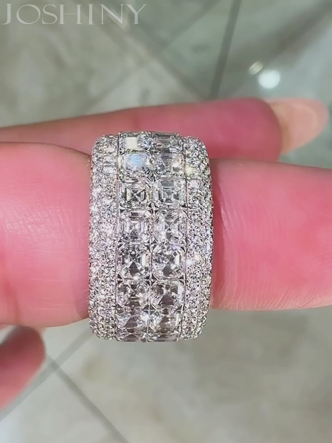 This is a gorgeous and stylish design ring that can be worn by both men and women. It is fully set with brilliant ace and round cut white stones. The craftsmanship is exquisitely detailed and sparkling! It is comfortable to wear and perfect for everyday matching wear. Total weight is approximately 6 carats.The ring is made of 925 silver throughout, with thick gold plating, which makes the luster last longer compared to other single layer plating. The style is gorgeous and stylish, bringing more possibilities for your fashion collocation.