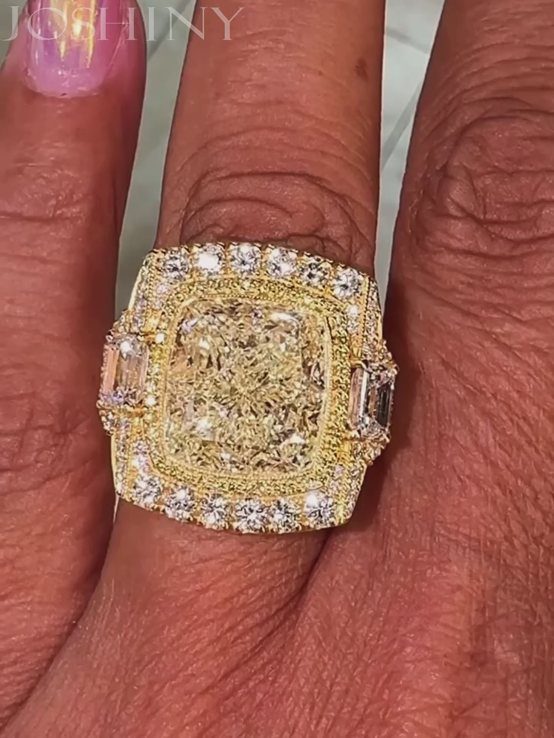 This is an engagement ring with an elegant and gorgeous design that makes a statement! The center is set with a sparkling cushion cut yellow main stone, flanked by 2 brilliant emerald cut white stones, and surrounded by sparkling round cut white and yellow stones of varying sizes. The entire ring is exquisitely crafted and sparkling! Perfect for many occasions. Total weight is approximately 6 carats.The ring is made of 925 silver throughout, with thick gold plating, which makes the luster last longer compared to other single layer plating. The style is gorgeous and exquisite, bringing more possibilities for your fashion collocation.