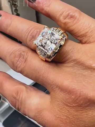This gorgeous engagement ring can be worn by both men and women. The center features a brilliant princess square cut white main stone. The ring arms are set with round and square cut white stones. The design is gorgeous and regal. The craftsmanship is exquisite. Total weight is approximately 6 carats. The ring is made of 925 silver throughout, with thick gold plating, which makes the luster last longer compared to other single layer plating. The style is personalized and nobel, bringing more possibilities for your fashion collocation.
