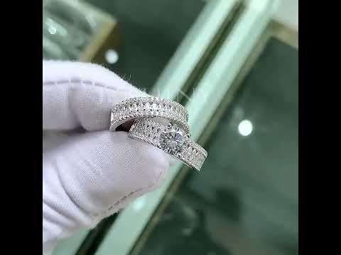 This elegant 2-piece engagement ring set looks great whether worn together or separately. Perfect for everyday wear. The center features a sparkling round cut white main stone. The openwork ring arm and matching band are pave set with marquise and round cut white stones. The design is simple and beautiful. Total weight is approximately 6 carats. The ring is made of 925 silver throughout, with thick gold plating, which makes the luster last longer compared to other single layer plating. The style is personalized and simple, bringing more possibilities for your fashion collocation.