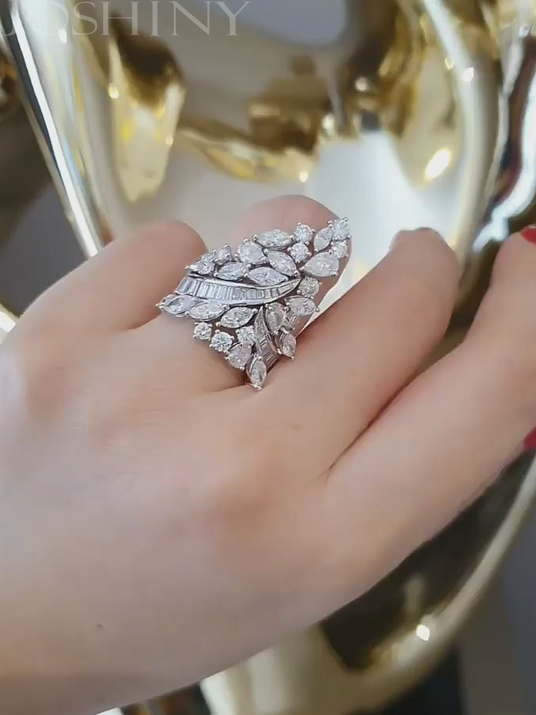 This gorgeous ring is as beautiful as a bird's wing. It is set with a cluster of brilliant white gemstones in multiple cuts. The craftsmanship is exquisite and the design is elegant. Total weight is approximately 8 carats. The ring is made of 925 silver throughout, with thick gold plating, which makes the luster last longer compared to other single layer plating. The style is personalized and gorgeous, bringing more possibilities for your fashion collocation.